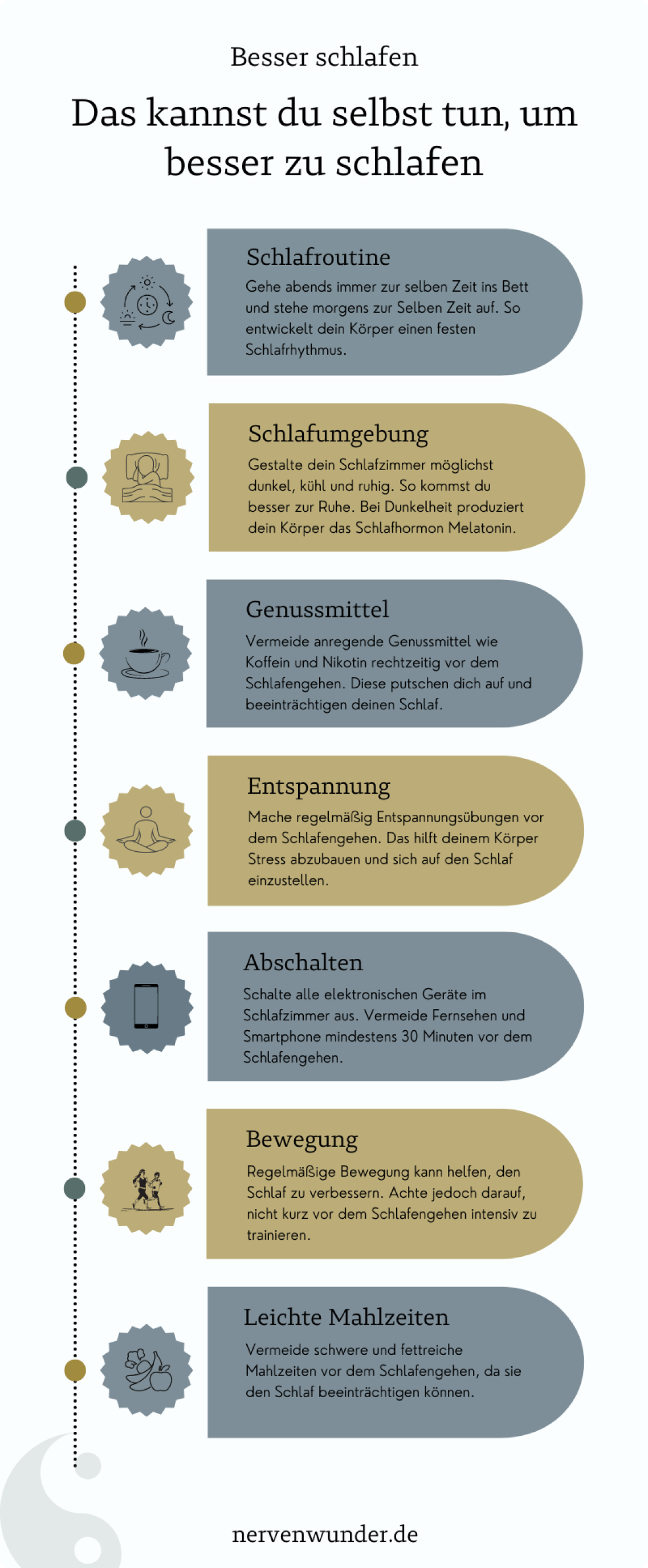 Guter Schlaf ist extrem wichtig, um körperlich und geistig gesund zu bleiben. Falls es dir schwerfällt, ein- oder durchzuschlafen, kannst du selbst schon einiges tun, um besser und erholsamer zu schlafen. Nachfolgend findest du einige bewährte Strategien, um deine Schlafgewohnheiten zu verbessern.
